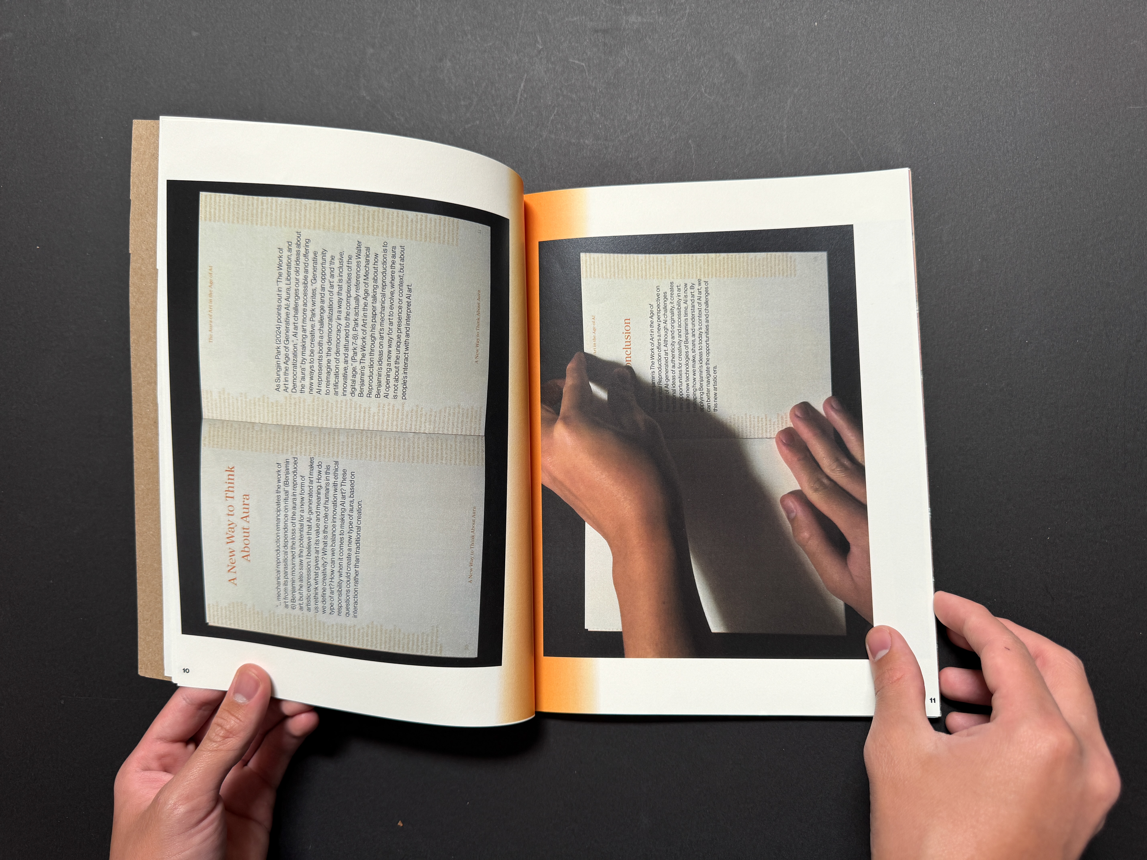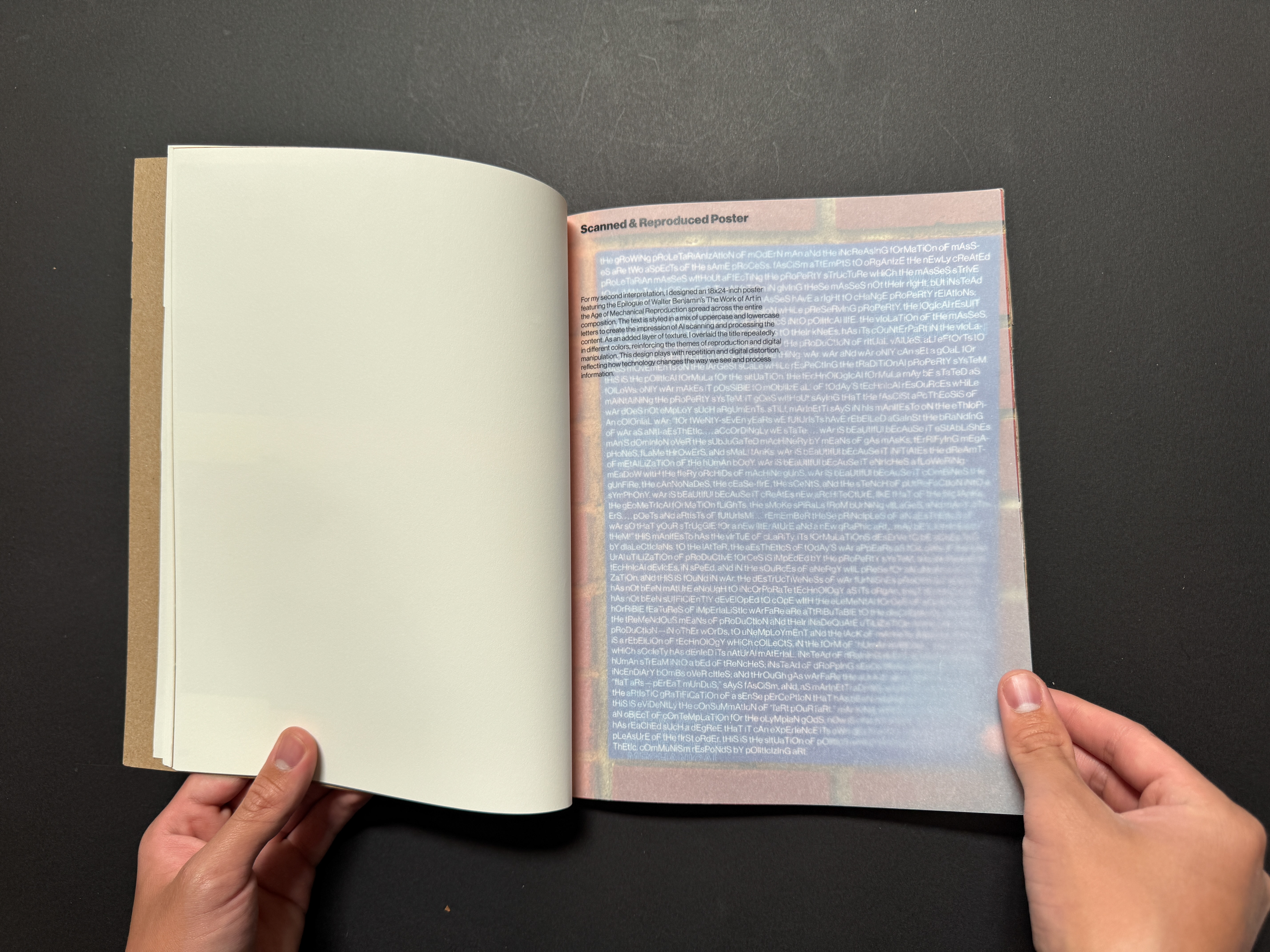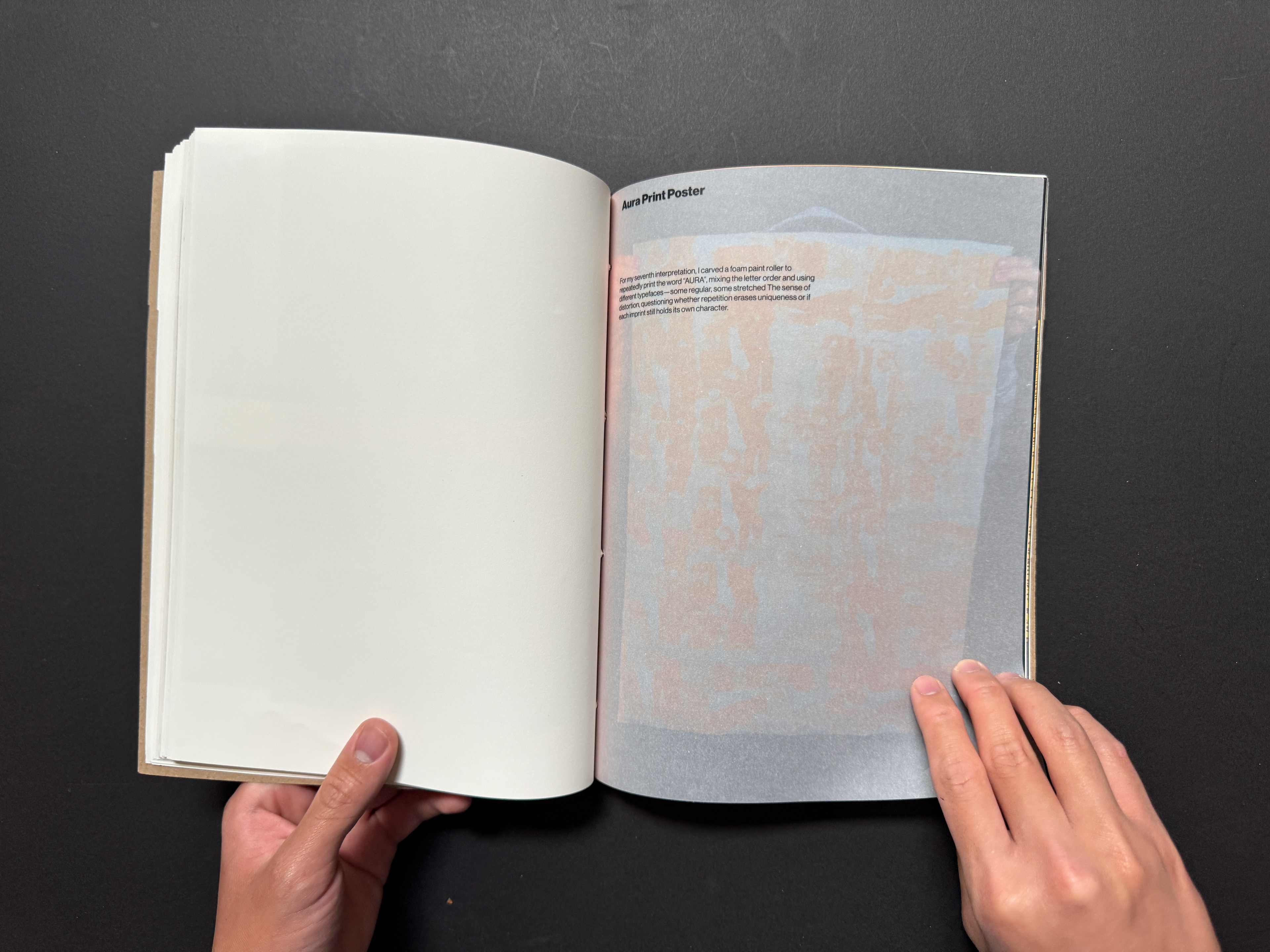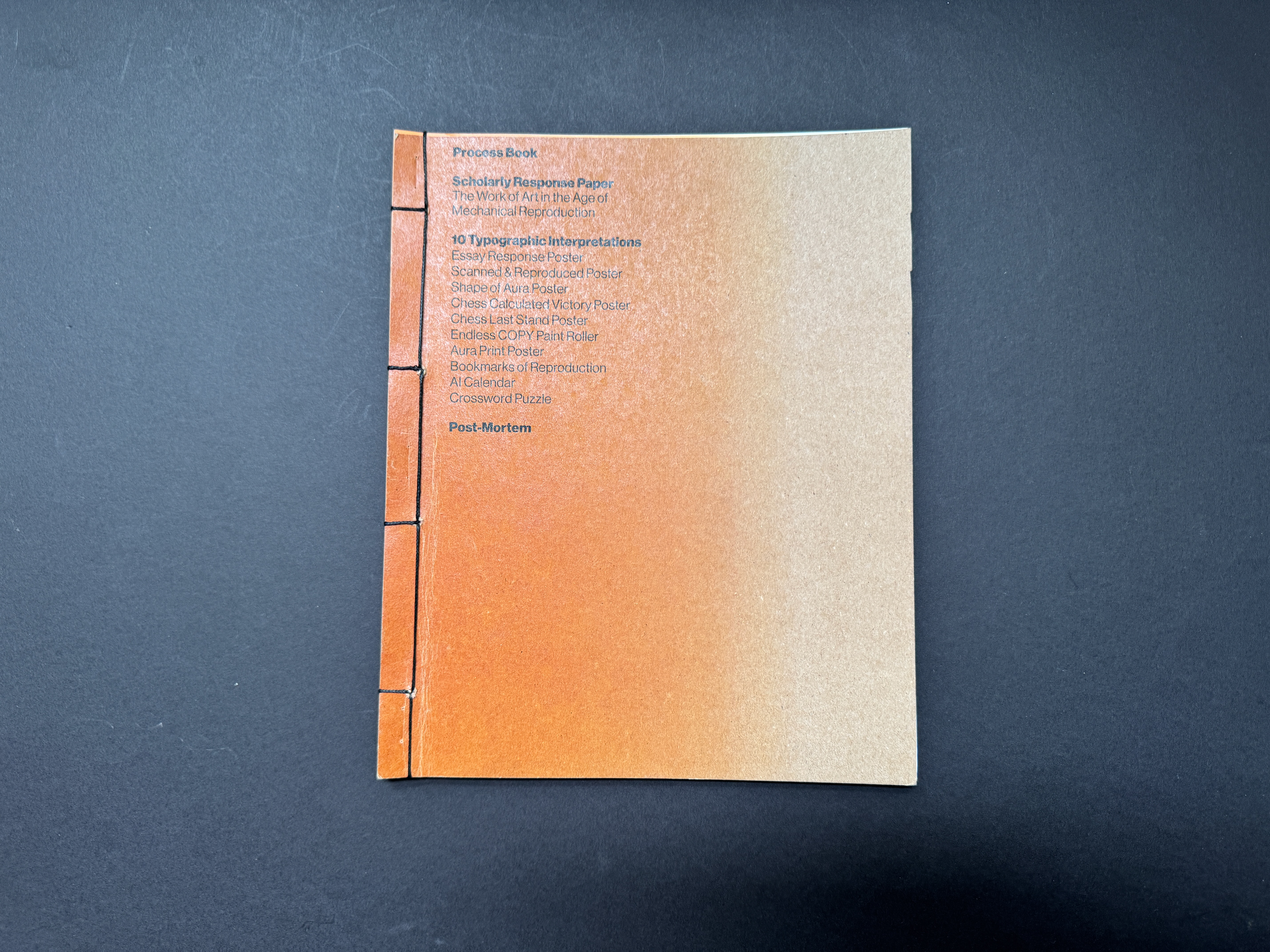 For this project, I critically analyzed Walter Benjamin’s essay The Work of Art in the Age of Mechanical Reproduction, exploring the effects of mechanical reproduction on the ‘aura’ of art. My work involved creating a scholarly response, which was accompanied by 10 typographic interpretations of Benjamin’s concepts. These interpretations spanned various mediums, including posters, apparel, and sculpture, each physically existing in the world and documented through photography. The project culminated in a physical Reflection Book, which captured the entire process, from research and creative interpretation to the installation of the work in its environment.