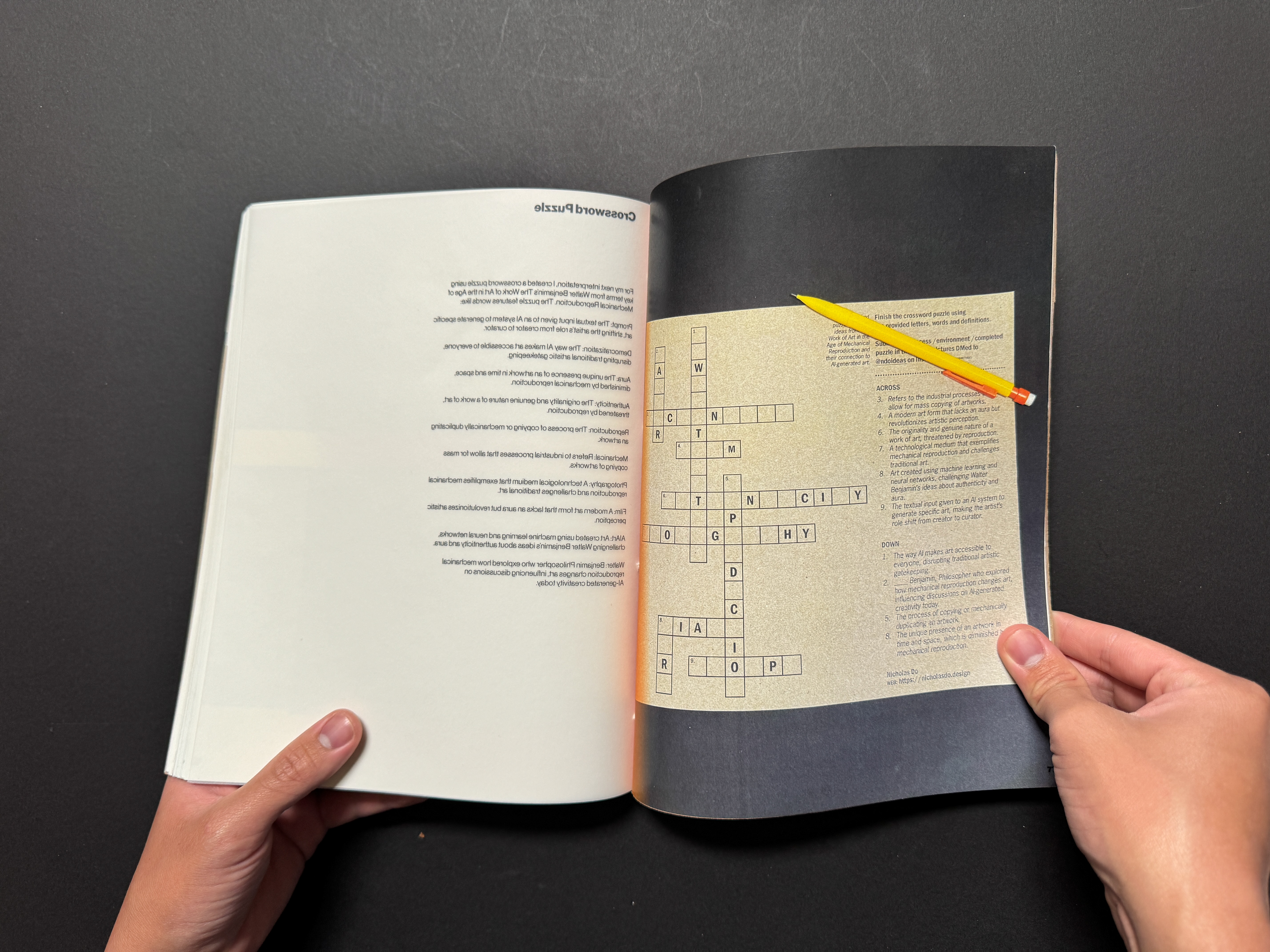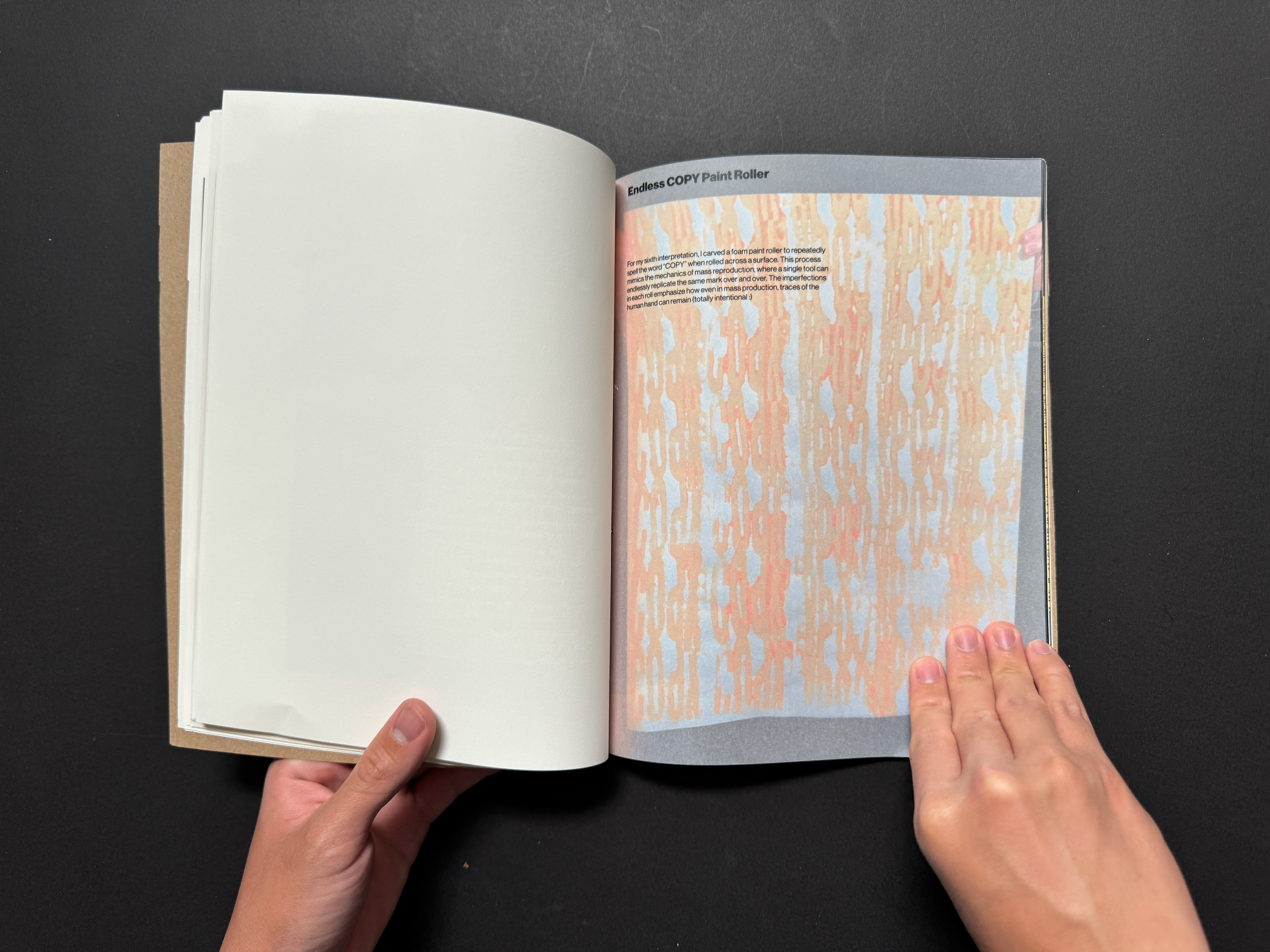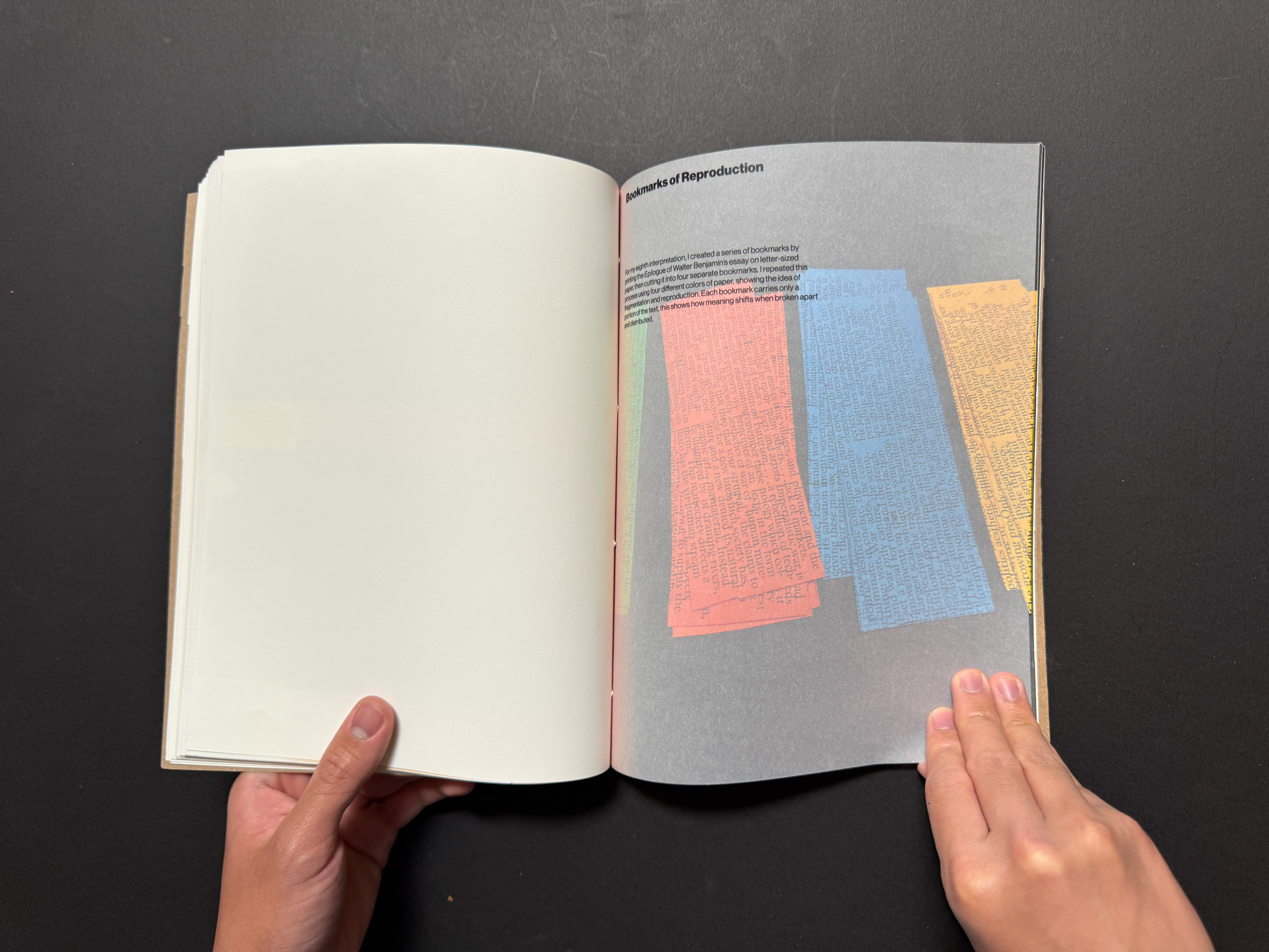 For this project, I critically analyzed Walter Benjamin’s essay The Work of Art in the Age of Mechanical Reproduction, exploring the effects of mechanical reproduction on the ‘aura’ of art. My work involved creating a scholarly response, which was accompanied by 10 typographic interpretations of Benjamin’s concepts. These interpretations spanned various mediums, including posters, apparel, and sculpture, each physically existing in the world and documented through photography. The project culminated in a physical Reflection Book, which captured the entire process, from research and creative interpretation to the installation of the work in its environment.